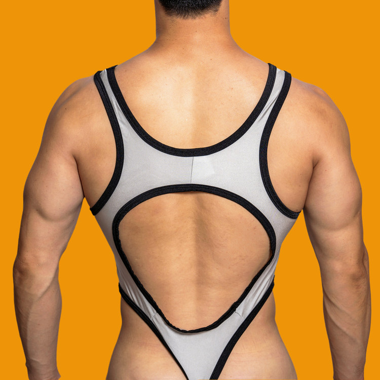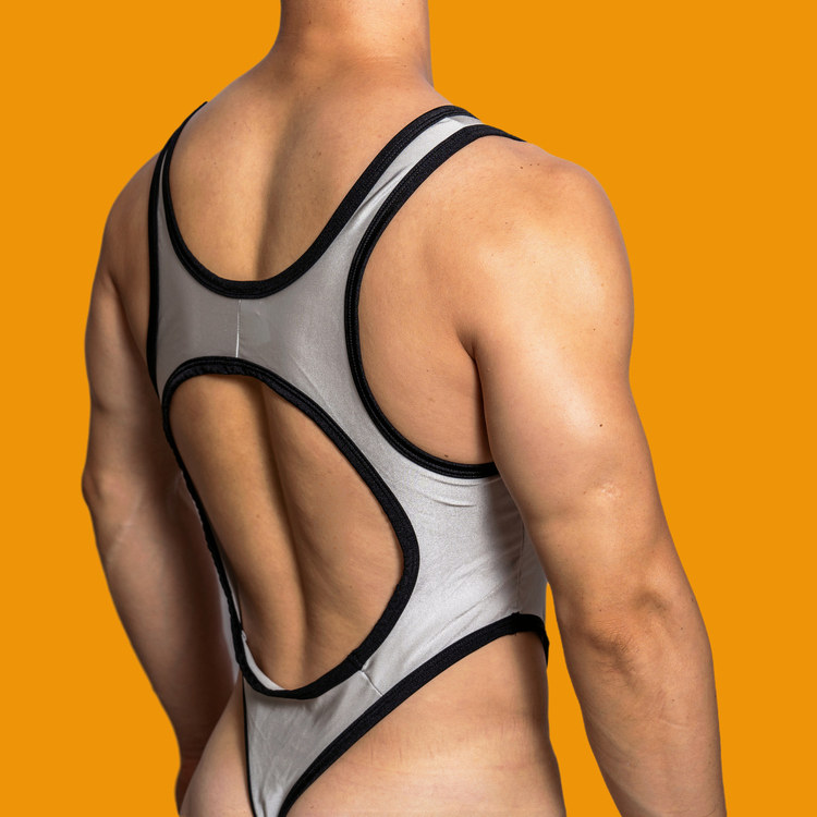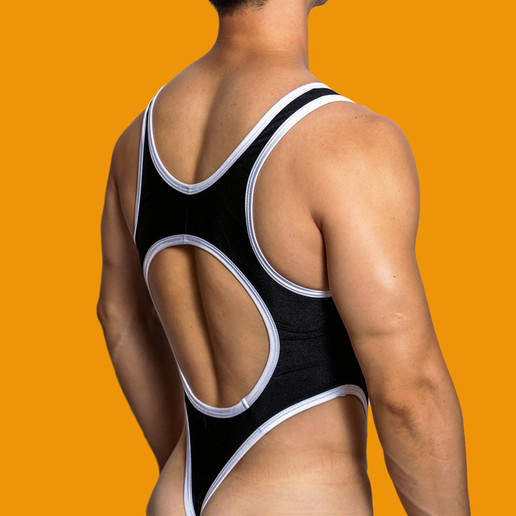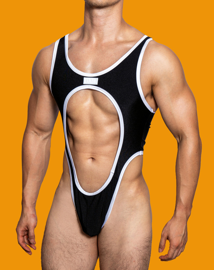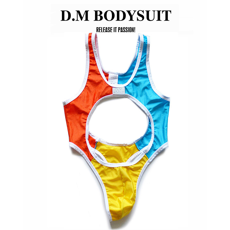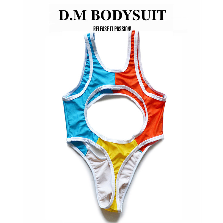 D.M men’s color block bodysuit with bold cutout design, stretch fabric for a snug fit. Perfect for intimate wear, cosplay, or bold casual styling.