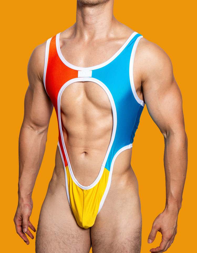 This D.M men’s color block bodysuit redefines bold style and comfort with its striking cutout design and stretch performance fabric. Crafted from ultra-soft, flexible material that hugs your physique without restriction, the vibrant red, blue, and yellow color block pattern delivers eye-catching appeal, while the chest cutout and thong bottom create a daring silhouette perfect for intimate moments, cosplay, or making a statement with casual layering. The sleeveless design and wide shoulder straps ensure a secure, supportive fit, and the moisture-wicking fabric keeps you cool and dry all day long. Finished with the signature D.M label, this one-piece bodysuit blends fearless fashion with uncompromising comfort for the modern man who isn’t afraid to stand out.